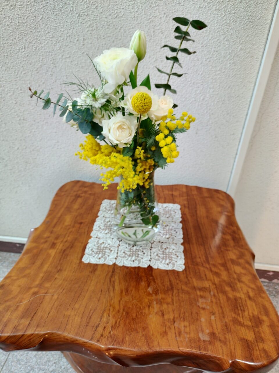 今日のお花です。年末のお花のアレンジメントから久々に新しいお花がやってきました。小さくてかわいらしいミモザ、白い薔薇、チューリップ、ユーカリ等々。黄色いボンボンはクラスペディアというお花だそうです。
